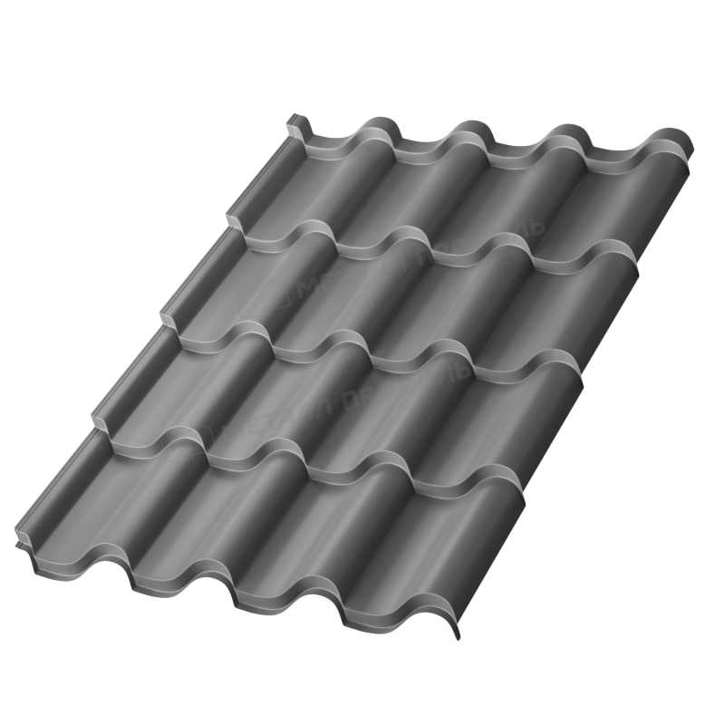 Профиль Монтерроса-M имитирует форму натуральной керамической черепицы с плавными волнами и четкими гранями. Высота ступеньки составляет 25 мм, а ширина полезной площади — 1100 мм при общей ширине листа 1190 мм. Это позволяет создавать элегантные крыши с минимальным количеством стыков, снижая риск протечек. Темно-серый оттенок подчеркивает рельеф, делая кровлю визуально объемной и привлекательной.