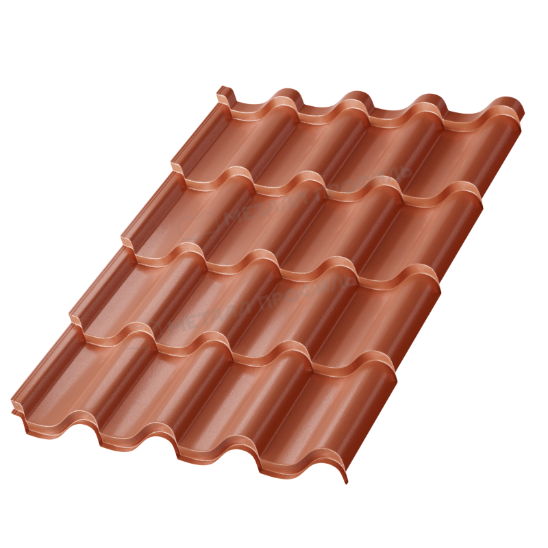 Профиль формирует волнообразную структуру, имитирующую традиционную керамическую черепицу. Высота волны составляет 24 мм, шаг – 350 мм, что обеспечивает оптимальную жесткость и простоту монтажа. Общая ширина листа – 1190 мм, полезная – 1100 мм, что минимизирует отходы при укладке. Такой дизайн способствует эффективному отводу воды и снега, предотвращая накопление осадков. Профиль адаптирован для скатных крыш с углом наклона от 12 градусов, подходя для различных архитектурных стилей.