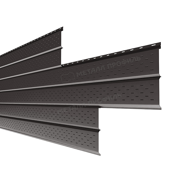 Софит — это специальные панели из серии Lбрус, оснащённые перфорацией на лицевой стороне. Они предназначены для подшивки карнизных свесов кровли. Благодаря аккуратному внешнему виду софит придаёт зданию завершённость и эстетическую целостность. Перфорированные отверстия обеспечивают вентиляцию подкровельного пространства, предотвращая скопление конденсата, а также развитие плесени и грибка.